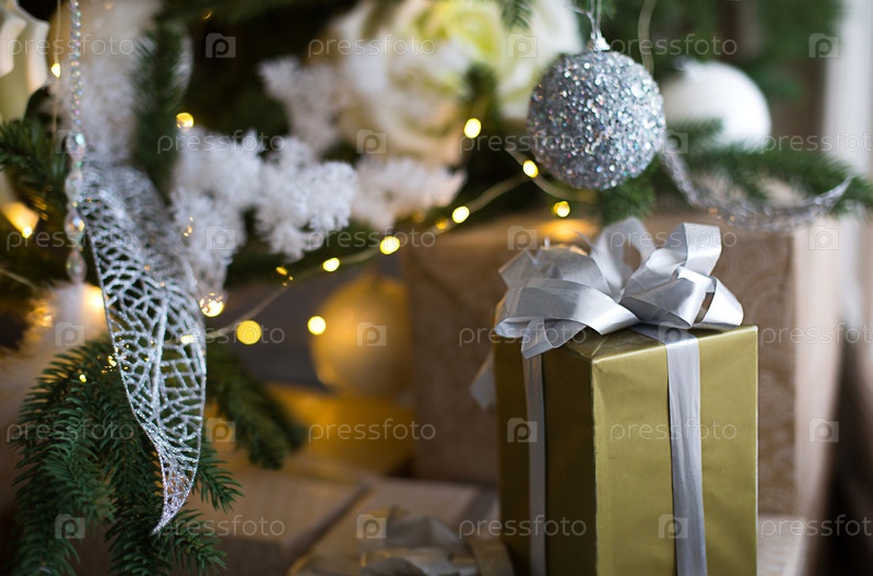 Подарочная коробка в золотой упаковке и серебряный бант под елку с белым декором. Новый год, Сочельник, поздравления для семьи, уют и ожидание чуда