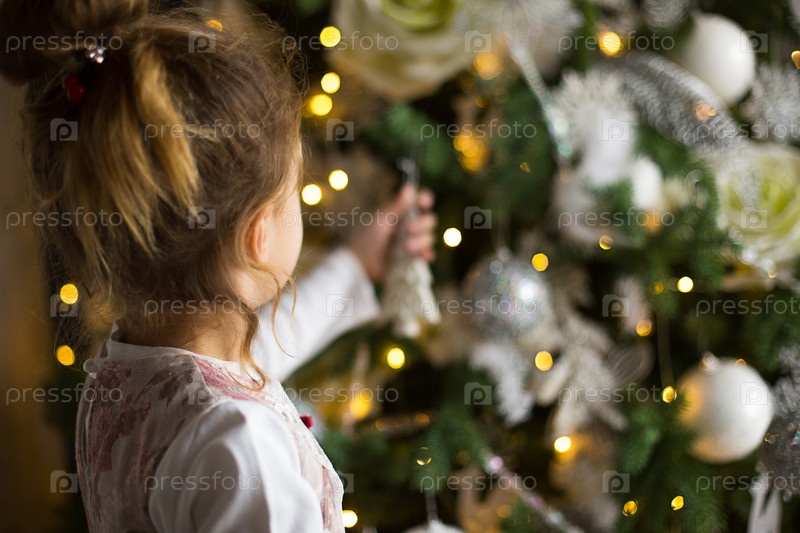 Маленькая девочка тянется рукой к елочной игрушке. Рождественский декор, ожидание праздника и чуда. Новый год. Белый, розовый и голубой декор, гирлянды из золотых огней