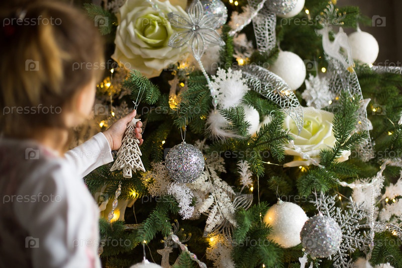 Маленькая девочка тянется рукой к елочной игрушке. Рождественский декор, ожидание праздника и чуда. Новый год. Белый, розовый и голубой декор, гирлянды из золотых огней