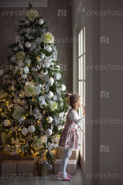 Маленькая девочка выглядывает из большого окна возле рождественской елки. В ожидании чуда, новогоднего белого декора в гостиной дома. Новый год, сказка и волшебство, детские мечты