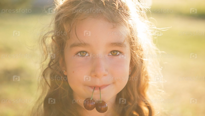 Веселая милая девушка с ягодами вишни во рту. Забавный летний портрет ребенка с вишней, дарами лета, летней поры