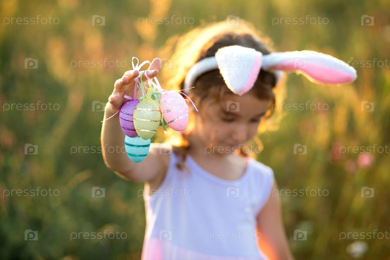 Милая забавная девушка с крашеными пасхальными яйцами весной на природе в поле с золотым солнечным светом и цветами. Праздник Пасхи, пасхальный кролик с ушами, разноцветные яйца в корзине. образ жизни