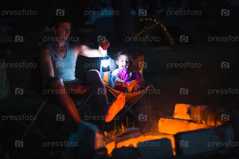 Папа и дочь сидят ночью у костра на открытом воздухе летом на природе. Семейный поход, посиделки у костра. День отца, барбекю. Кемпинговый фонарь и палатка