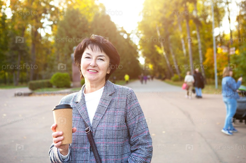 Портрет сеньоры в парке с многоразовой пластиковой чашкой кофе. Переработка и экология, ноль отходов. Прогулка на свежем воздухе, счастливый возраст на 50 лет