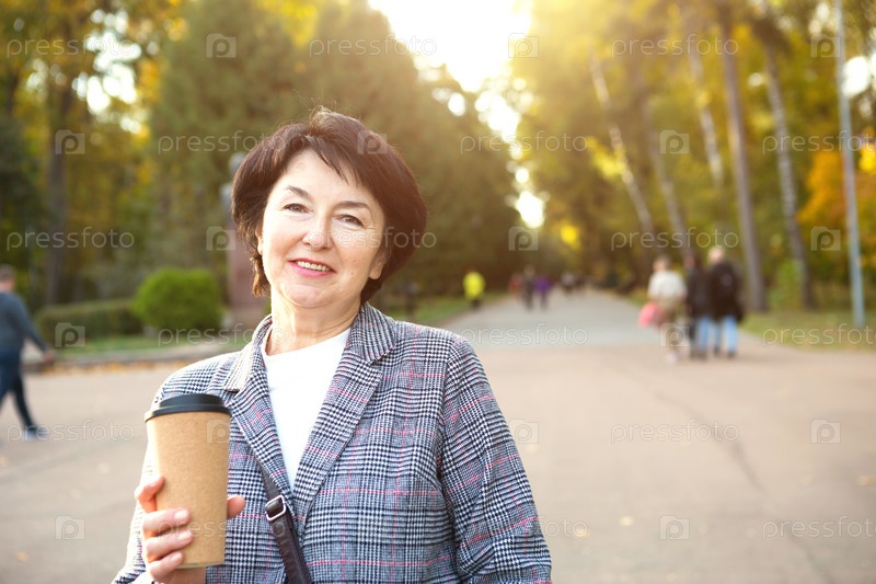 Портрет сеньоры в парке с многоразовой пластиковой чашкой кофе. Переработка и экология, ноль отходов. Прогулка на свежем воздухе, счастливый возраст на 50 лет