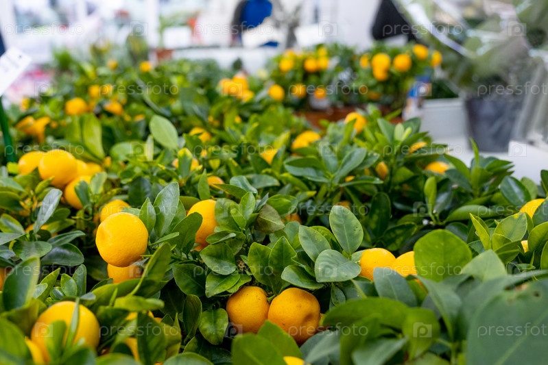Мандариновое дерево в цветочном горшке с фруктами на полке цветочного магазина. Комнатное растение мандарин, купить в подарок, выращивание дома