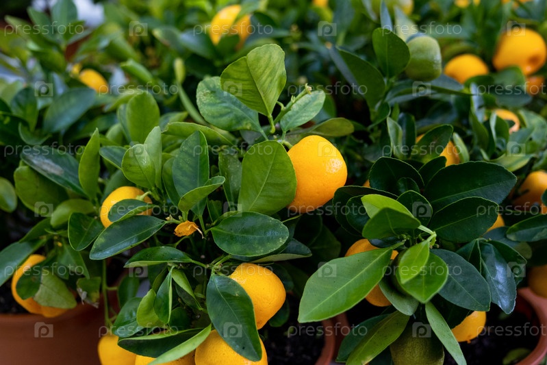 Мандариновое дерево в цветочном горшке с фруктами на полке цветочного магазина. Комнатное растение мандарин, купить в подарок, выращивание дома
