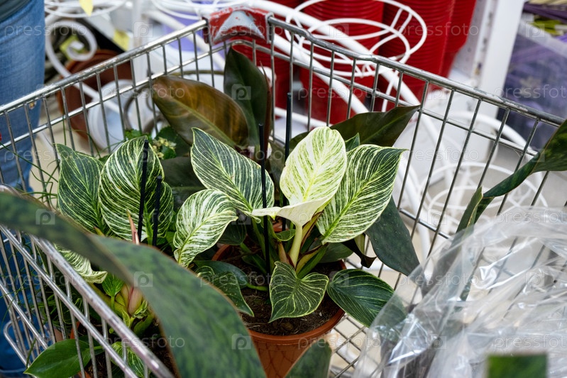Горшечные растения в тележке цветочного магазина - покупка домашних растений для выращивания и ухода, в подарок