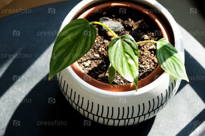 Philodendron Plowmanii - небольшое укоренившееся стекло в горшке крупным планом.Взращение редких видов комнатных растений, выращивание и уход за ароидами