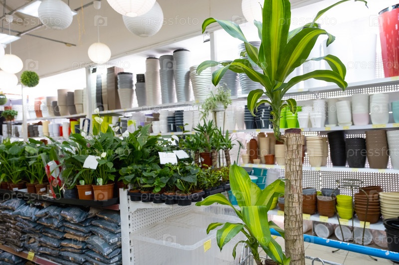 Горшечные растения в тележке цветочного магазина - покупка домашних растений для выращивания и ухода, в подарок