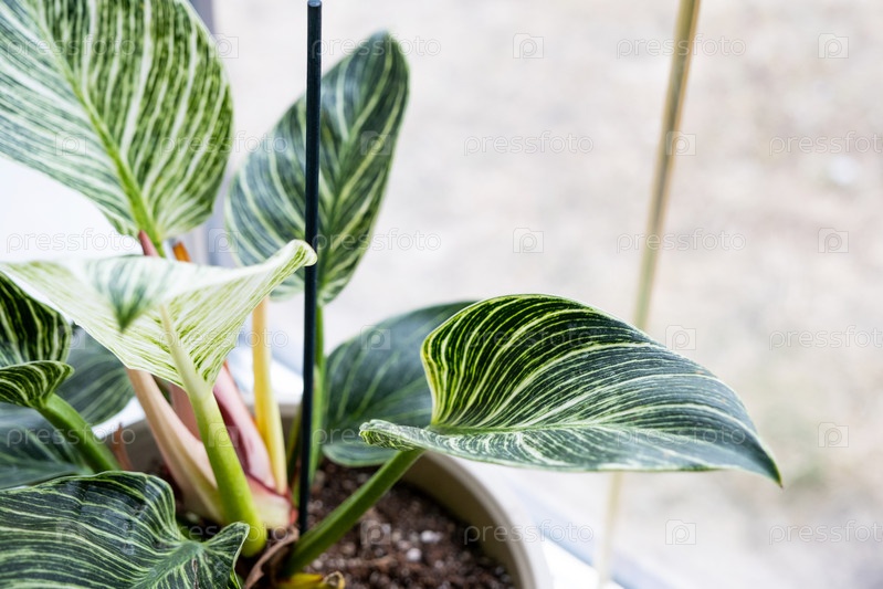 Комнатное растение филодендрон Биркин на подоконнике у окна. Выращивание и уход за комнатным растением