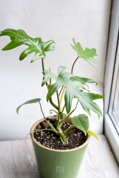 Филодендрон Майо в интерьере дома. Резные листья комнатного растения в горшке. Уход и выращивание тропических растений, теплица