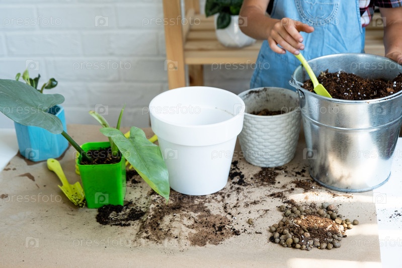 Девушка пересаживает комнатное растение филодендрон в новую почву с дренажем. Уход за горшечными растениями, полив, подкормка, вручную посыпать смесью совком и утрамбовать в горшке. Хобби и окружающая среда