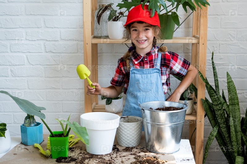Девушка пересаживает комнатное растение филодендрон в новую почву с дренажем. Уход за горшечными растениями, полив, подкормка, вручную посыпать смесью совком и утрамбовать в горшке. Хобби и окружающая среда