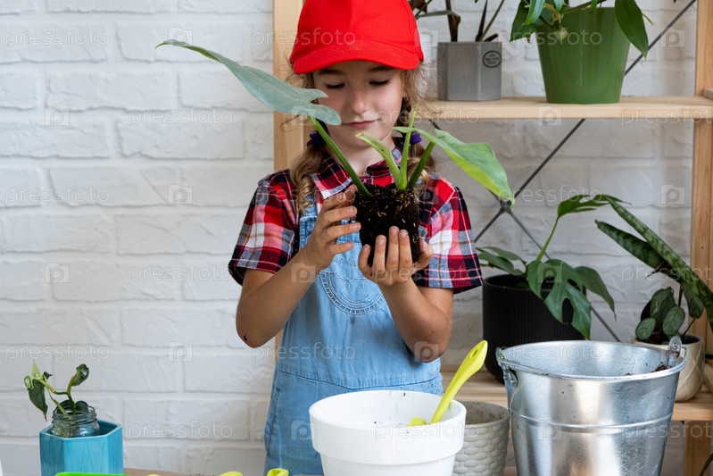 Девушка пересаживает комнатное растение филодендрон в новую почву с дренажем. Уход за горшечными растениями, полив, подкормка, вручную посыпать смесью совком и утрамбовать в горшке. Хобби и окружающая среда