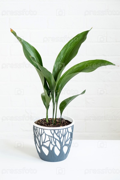 Новый росток аспидистры крупным планом. Комнатное растение с жесткими листьями, растущее из земли