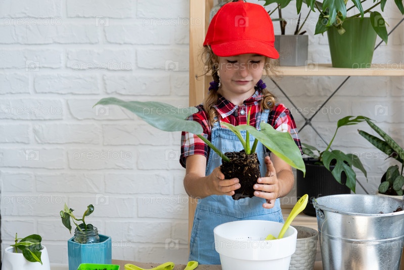 Девушка пересаживает комнатное растение филодендрон в новую почву с дренажем. Уход за горшечными растениями, полив, подкормка, вручную посыпать смесью совком и утрамбовать в горшке. Хобби и окружающая среда