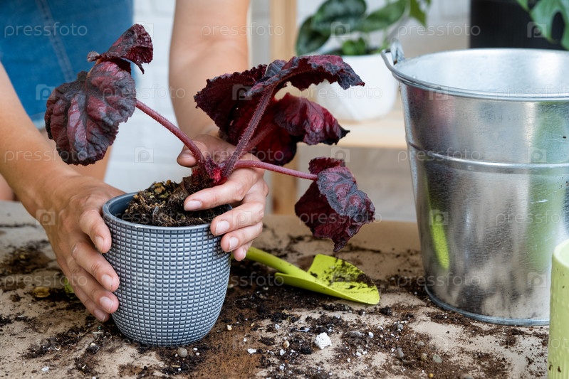 Пересадка домашнего растения Бегония в горшок. Женщина сажает черешковый земляной ком с корнями в новую почву. Уход за растением в горшке, руки крупным планом