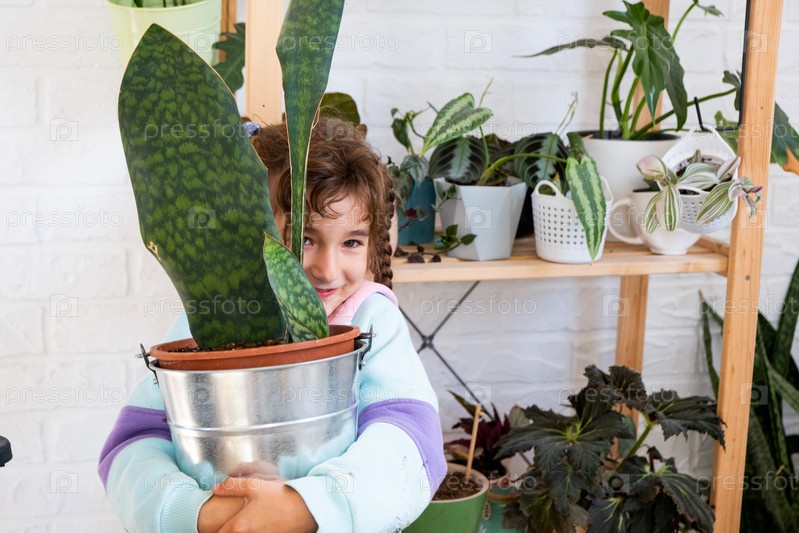 Девушка с удовольствием ухаживает за домашними растениями, пересаживает их в новый грунт и горшок, обнимает суккулентную сансивиерию, эпифиллум. Увлечения ребенка, помощь взрослому по дому, окружающая среда
