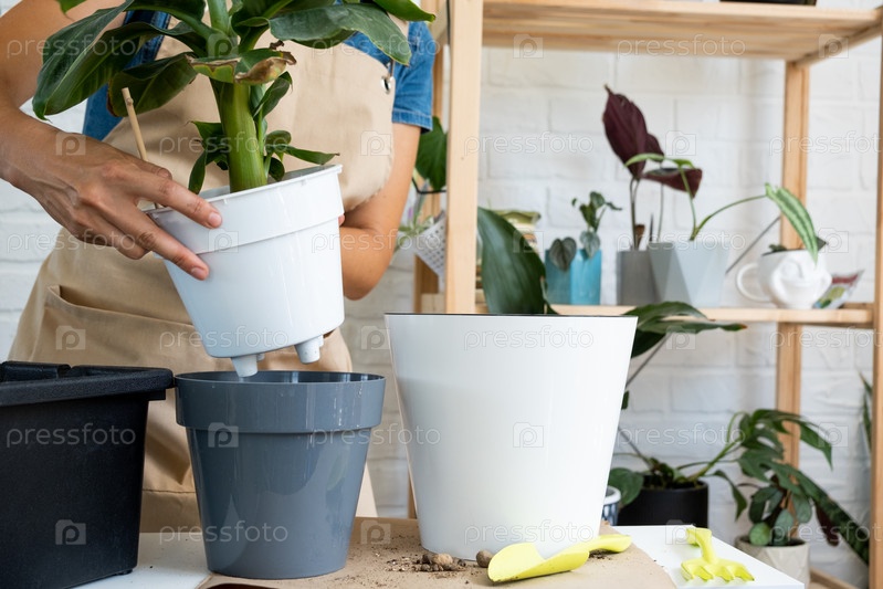 Пересадка домашнего горшечного растения банановая пальма Муса в горшок с автоматическим поливом. Пересадка в новую землю, забота женских рук о тропическом растении, хобби и окружающая среда