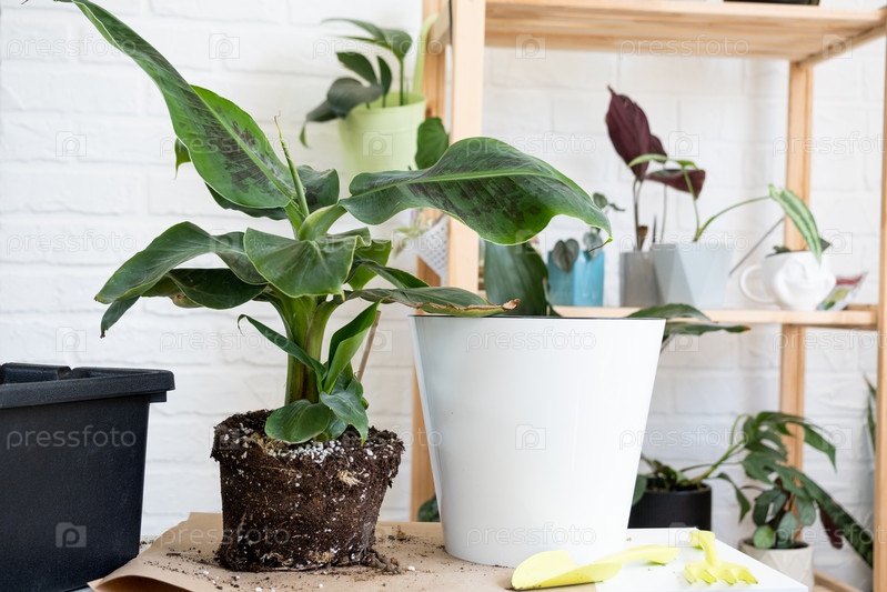 Пересадка домашнего горшечного растения банановая пальма Муса в горшок с автоматическим поливом. Пересадка в новую землю, забота женских рук о тропическом растении, хобби и окружающая среда