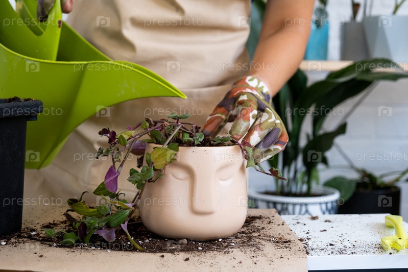 Пересадка домашнего растения в новый горшок. Пересадка филодендрона, экзотические растения, Уход и размножение горшечного растения, руки крупным планом