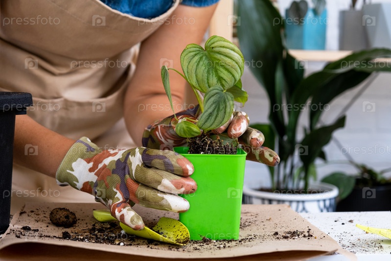 Пересадка домашнего растения редкого Филодендрона Мамеи в новый горшок. Женщина сажает стебель с корнями в новую почву. Уход и размножение растения в горшке, руки крупным планом