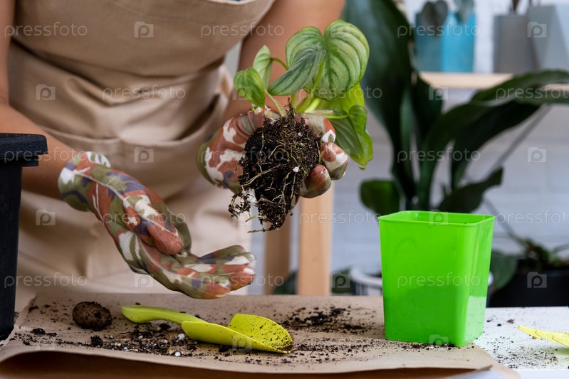 Пересадка домашнего растения редкого Филодендрона Мамеи в новый горшок. Женщина сажает стебель с корнями в новую почву. Уход и размножение растения в горшке, руки крупным планом