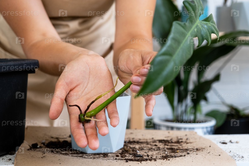 Стебель домашнего растения с корнями для размножения и посадки в горшок с грунтом. Хобби и уход за горшечными растениями, селекционное дело, черенкование
