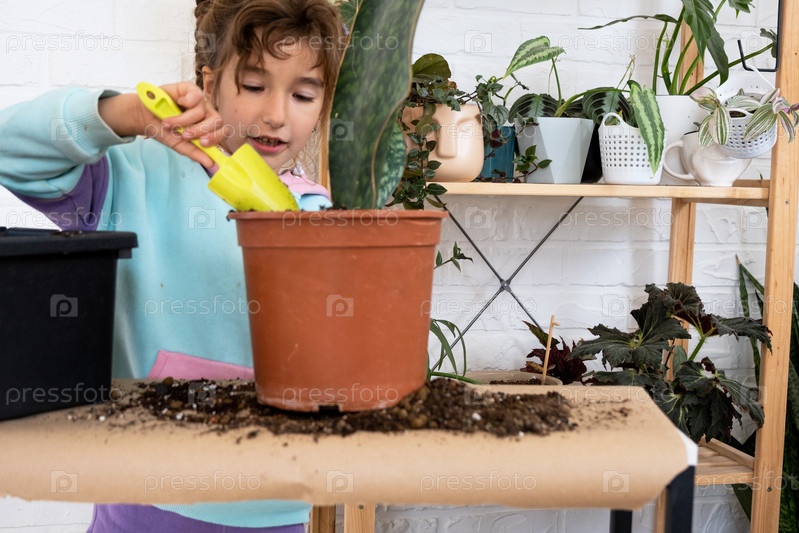 Девушка с удовольствием ухаживает за домашними растениями, пересаживает их в новый грунт и горшок, обнимает суккулентную сансивиерию, эпифиллум. Увлечения ребенка, помощь взрослому по дому, окружающая среда