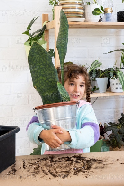 Девушка с удовольствием ухаживает за домашними растениями, пересаживает их в новый грунт и горшок, обнимает суккулентную сансивиерию, эпифиллум. Увлечения ребенка, помощь взрослому по дому, окружающая среда
