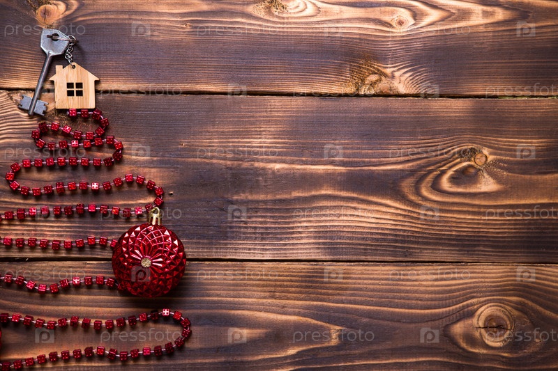Ключ от дома с брелком на вершине елки из красных квадратных бусин. Квартира лежала на деревянном фоне. Строительство или покупка дома в новом году. Ипотека, аренда недвижимости. Место для текста