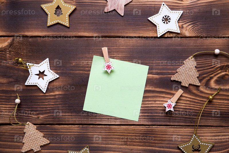 Рождественская плоская планировка деревянных звезд, елей и прищепок на темном фоне с квадратным листом для заметок в центре. Новогодняя рамка, место для текста. Новогодние игрушки, список дел, открытка
