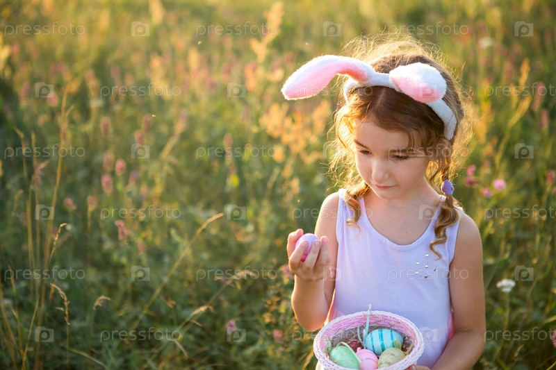 Милая забавная девушка с крашеными пасхальными яйцами весной на природе в поле с золотым солнечным светом и цветами. Праздник Пасхи, пасхальный кролик с ушами, разноцветные яйца в корзине. образ жизни