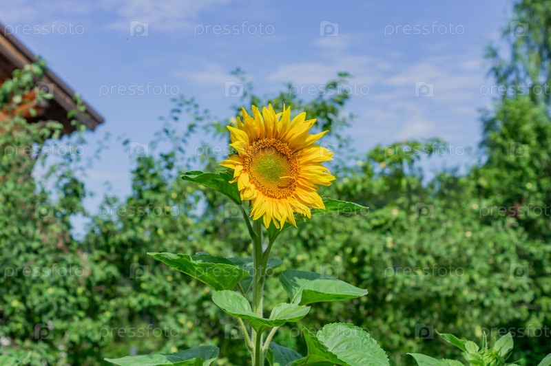 Яркий подсолнух в саду на фоне голубого неба