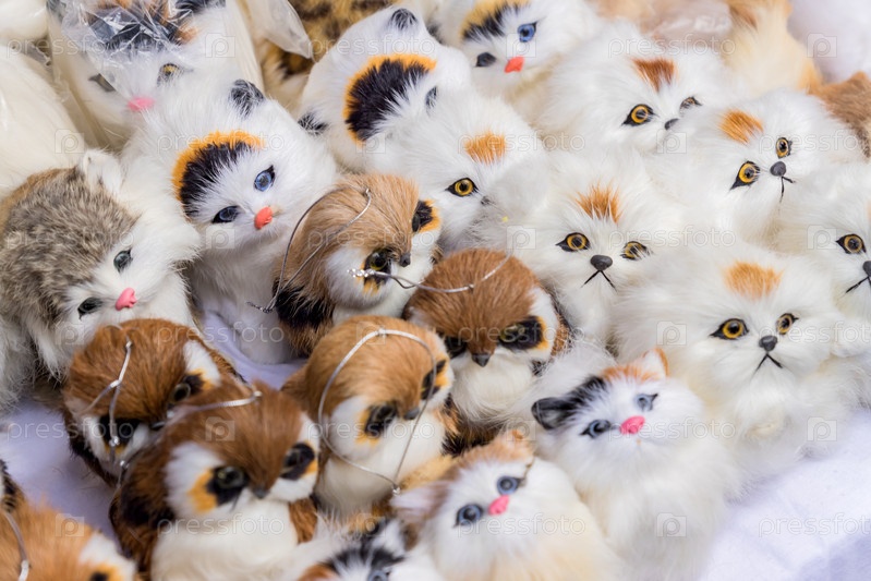 Москва, Россия - 18 февраля 2018 г.: меховые игрушки - кошки и совы для продажи на уличном рынке