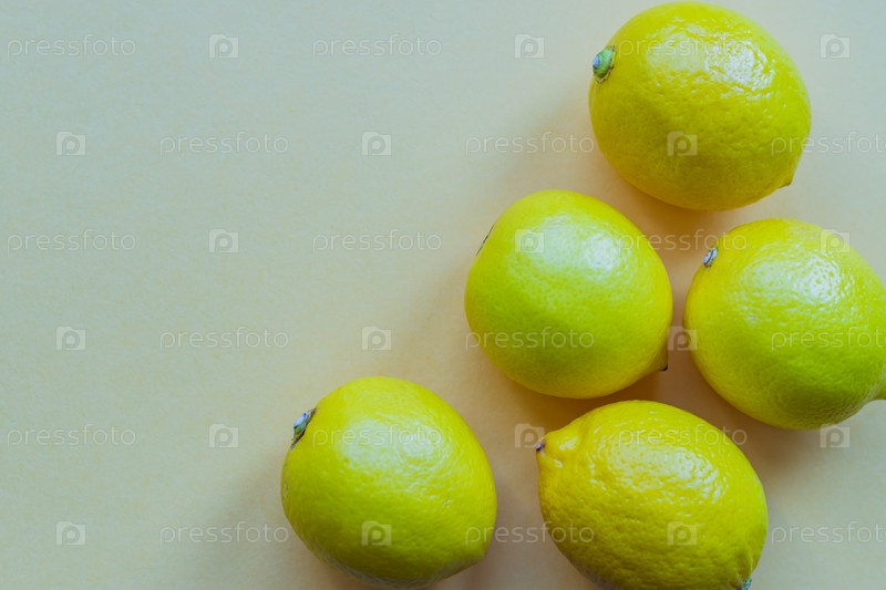 Вид сверху на пять свежих лимонов на деревянном столе, крупным планом