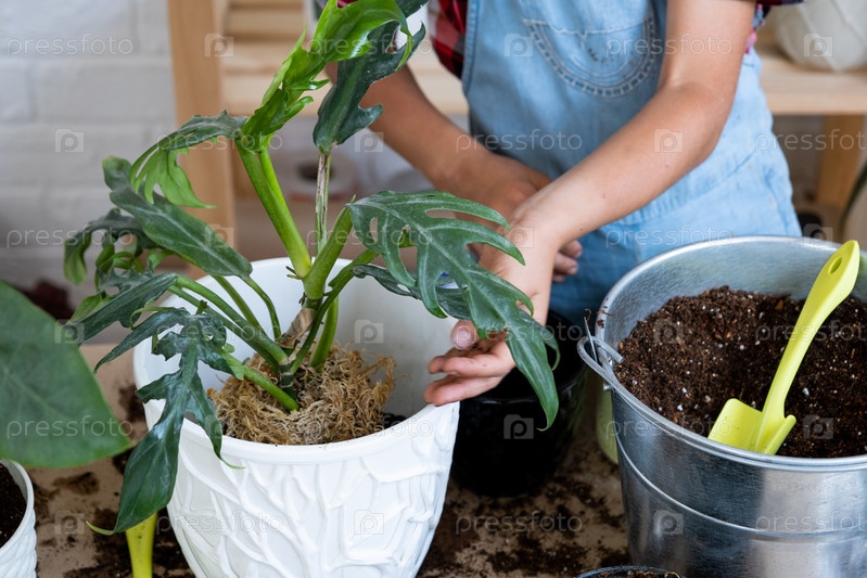Девушка пересаживает комнатное растение филодендрон в новую почву с дренажем. Уход за горшечными растениями, полив, подкормка, вручную посыпать смесью совком и утрамбовать в горшке. Хобби и окружающая среда