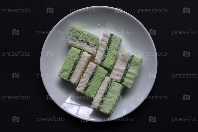 Вкусные зеленые и белые кусочки пастилы с кокосом на тарелке. Сладкая закуска из пастилы к чаю
