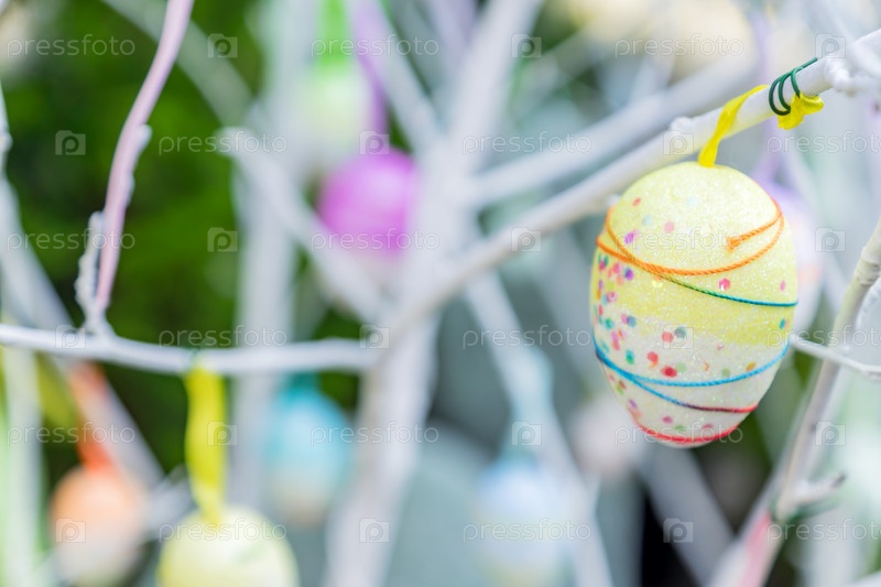 Красочное пасхальное яйцо висит на ветке дерева, крупным планом