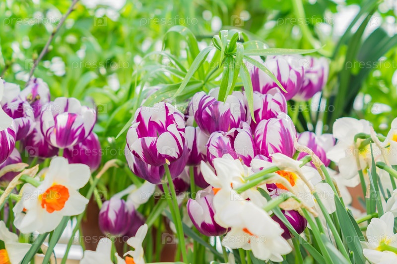 Цветущие тюльпаны и нарциссы в ботаническом саду