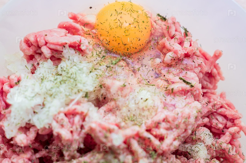 Фарш в миске с сырым яйцом, специями и нарезанным луком для приготовления котлет, выборочный фокус