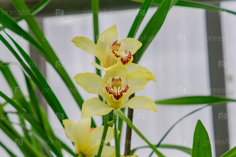 Ветвь желтого экзотического цветка орхидеи крупным планом