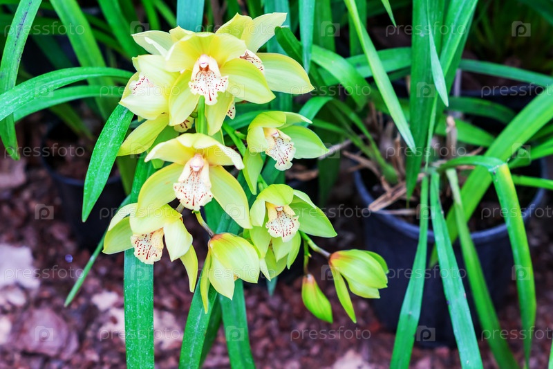 Красивая цветущая ветка желтой орхидеи в ботаническом саду