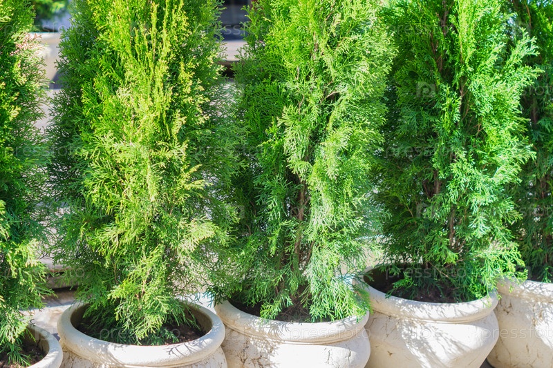 Молодые деревья кипариса в горшках на улице. Оформление городского парка