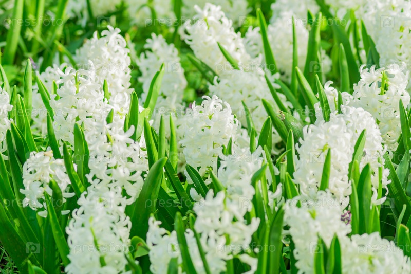 Поле белых цветущих гиацинтов в весеннем саду