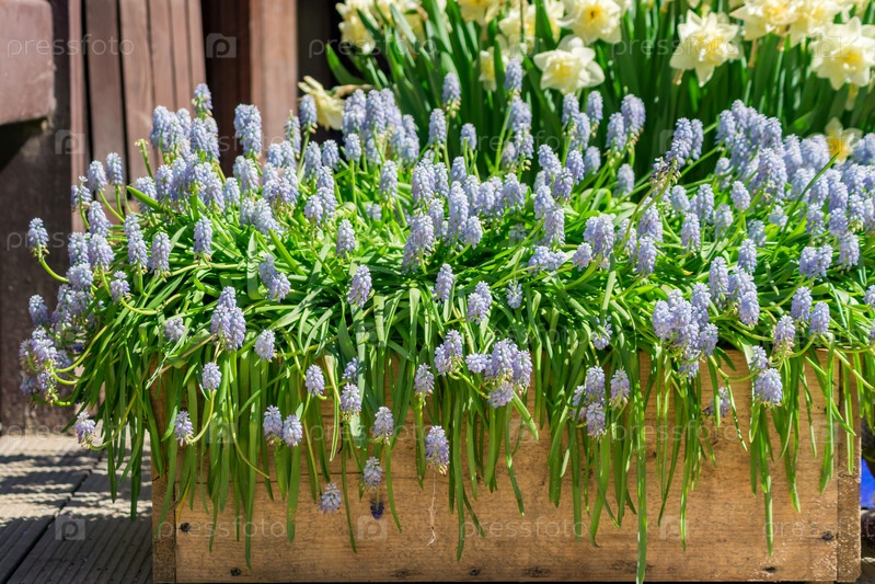 Цветущие цветы мускари в деревянном горшке на открытом воздухе, украшение сада