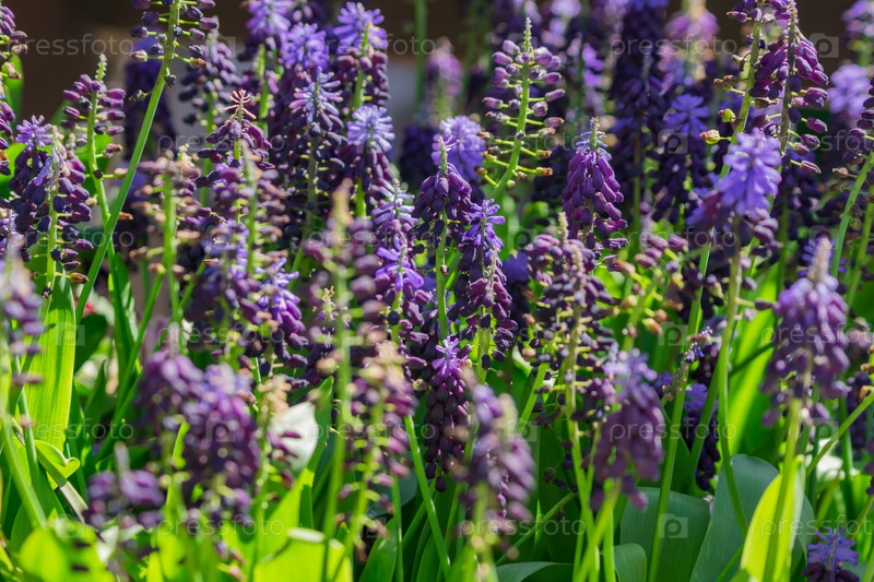 Поле цветущих мускари в весеннем саду