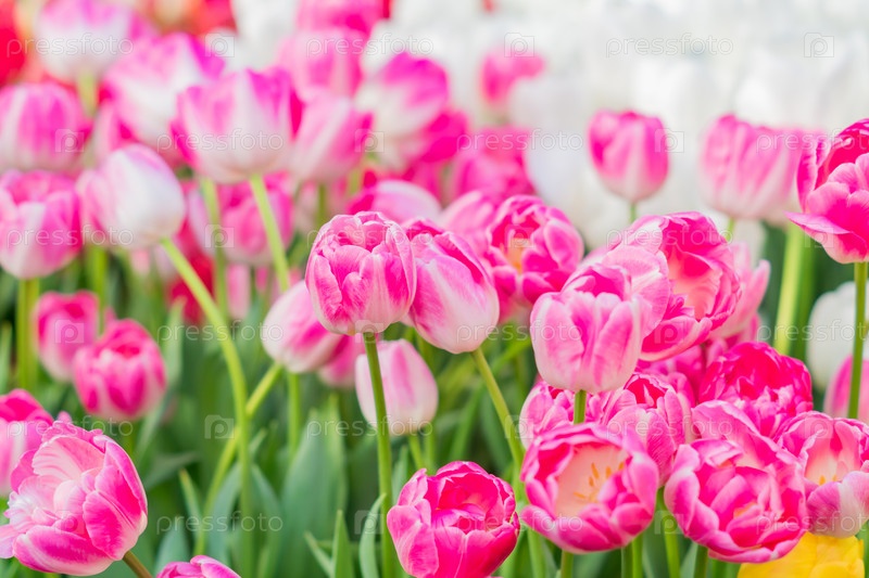 Поле цветущих разноцветных тюльпанов, весенние цветы в саду