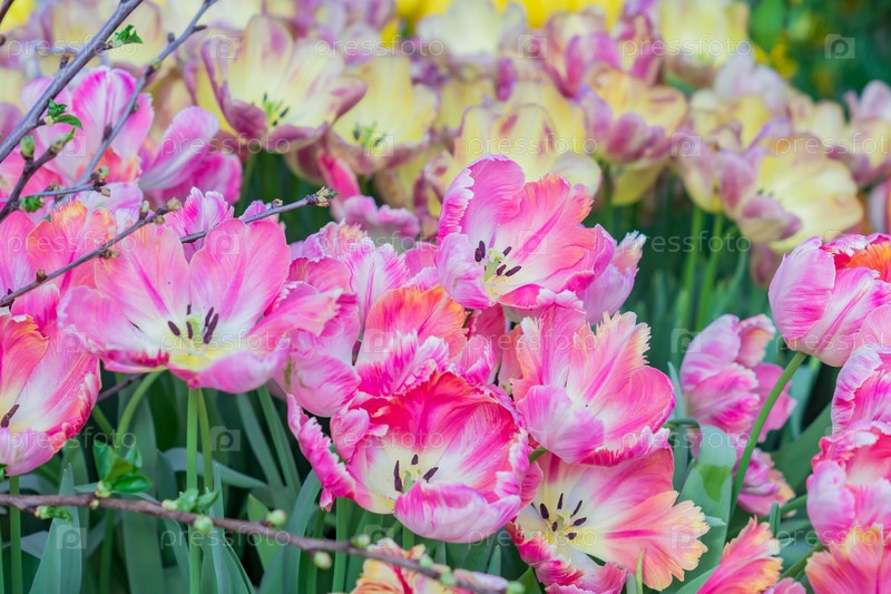 Поле цветущих красочных тюльпанов, весенние цветы в саду